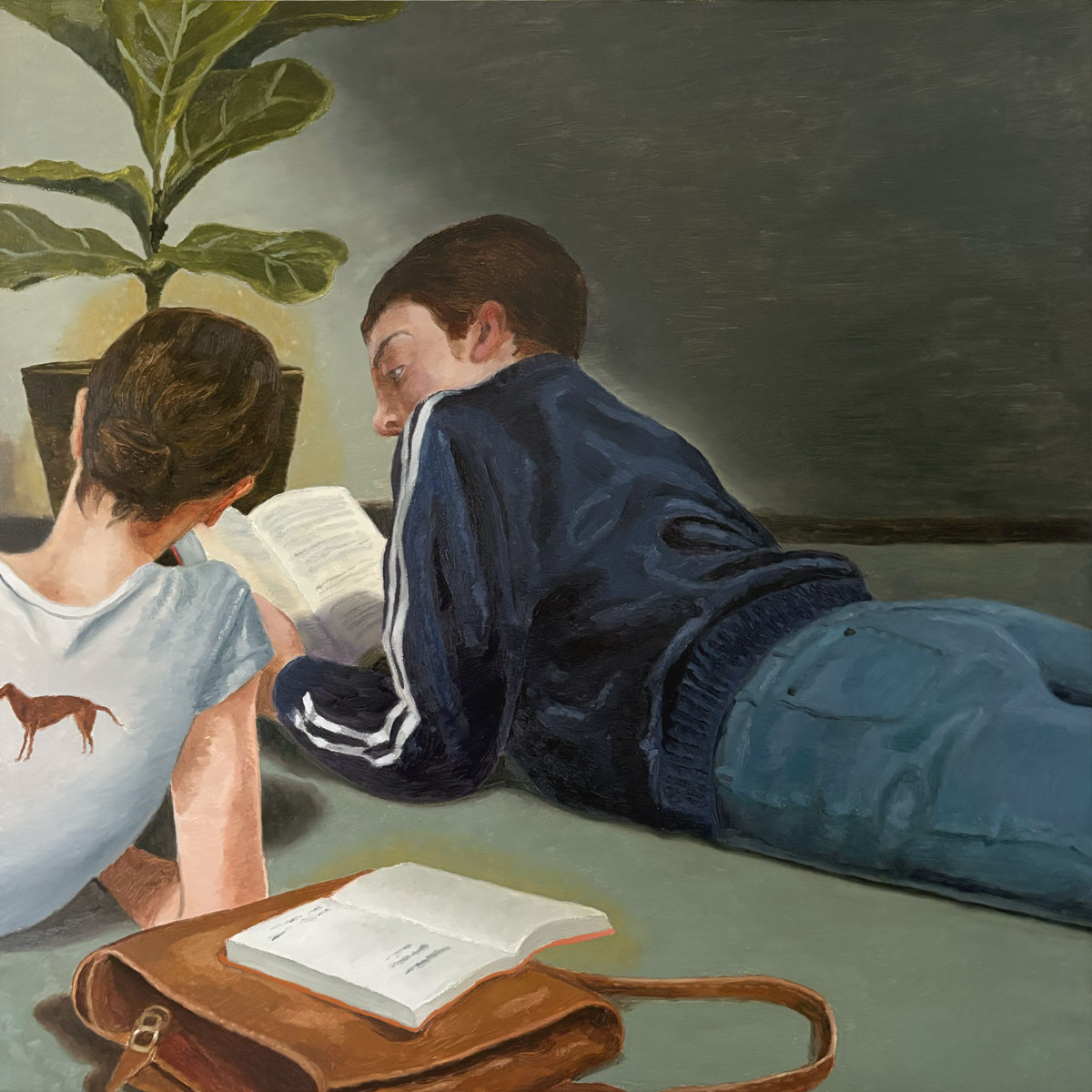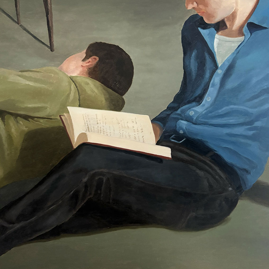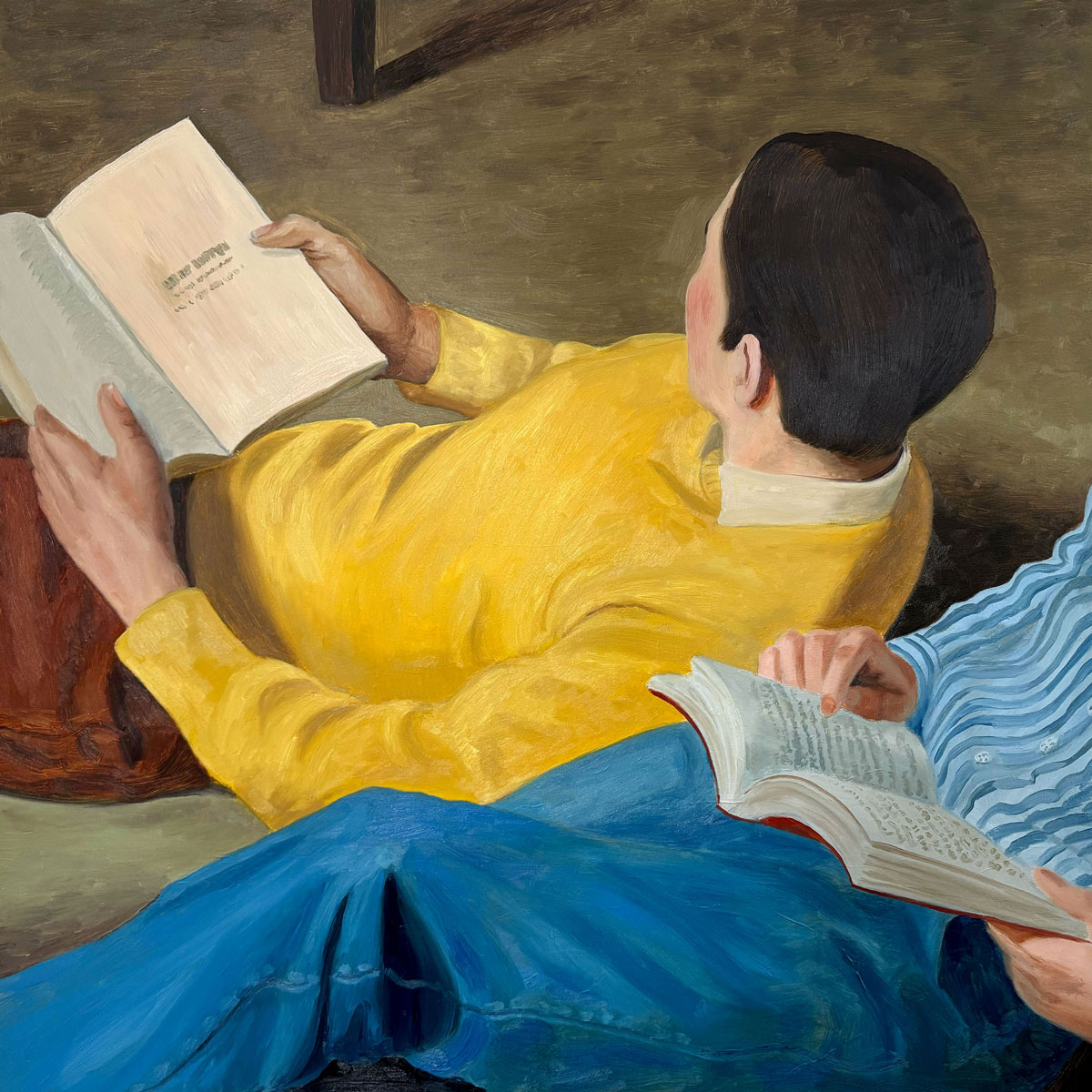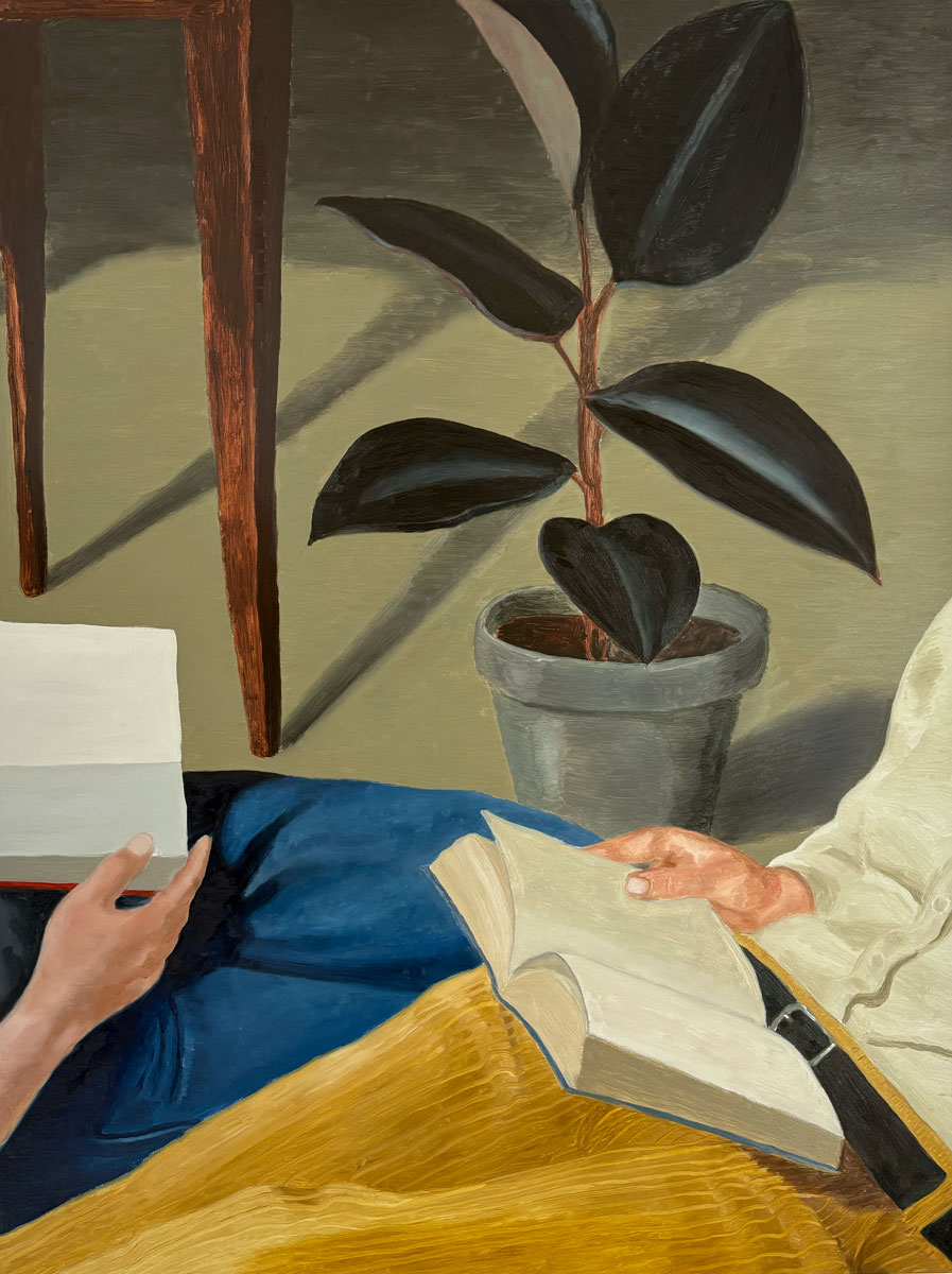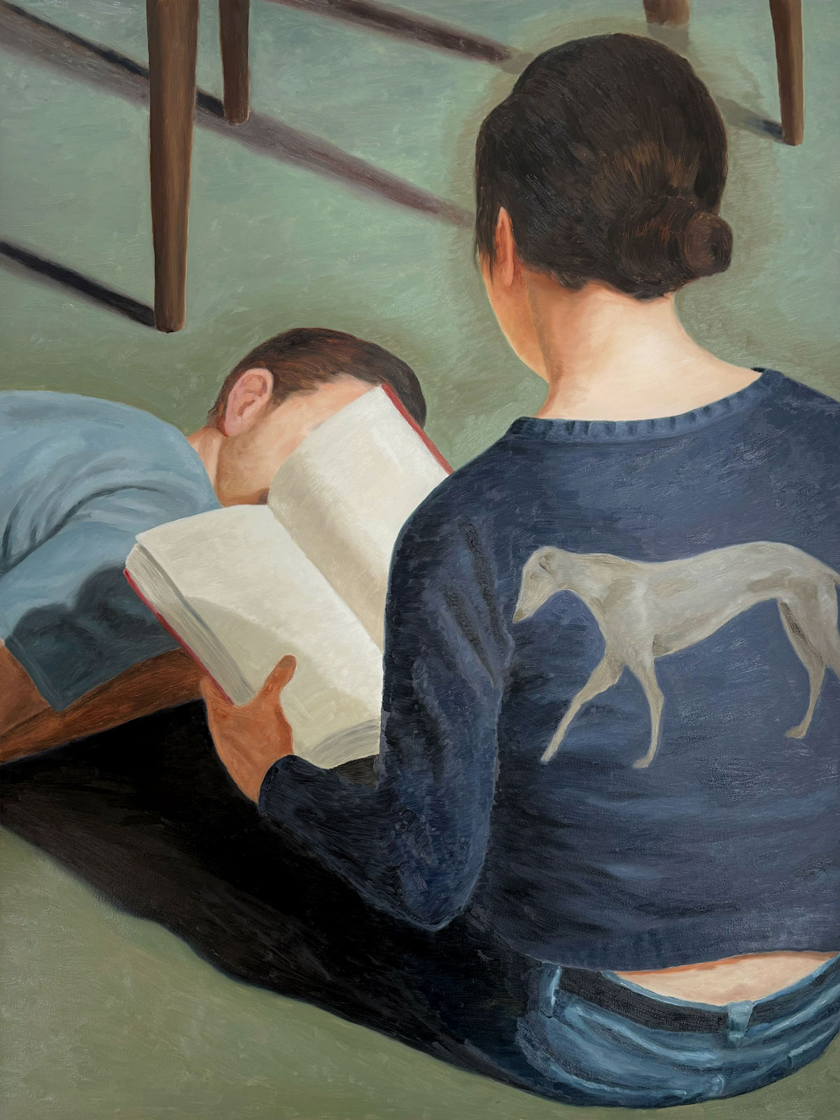 The paintings often center on ordinary situations that grow strange under sustained attention: a room, a gesture, a figure absorbed in reading, objects resting on a table. With time, the familiar recedes.